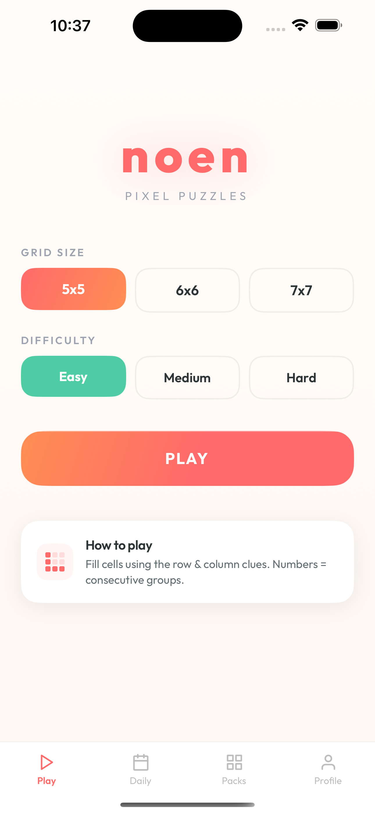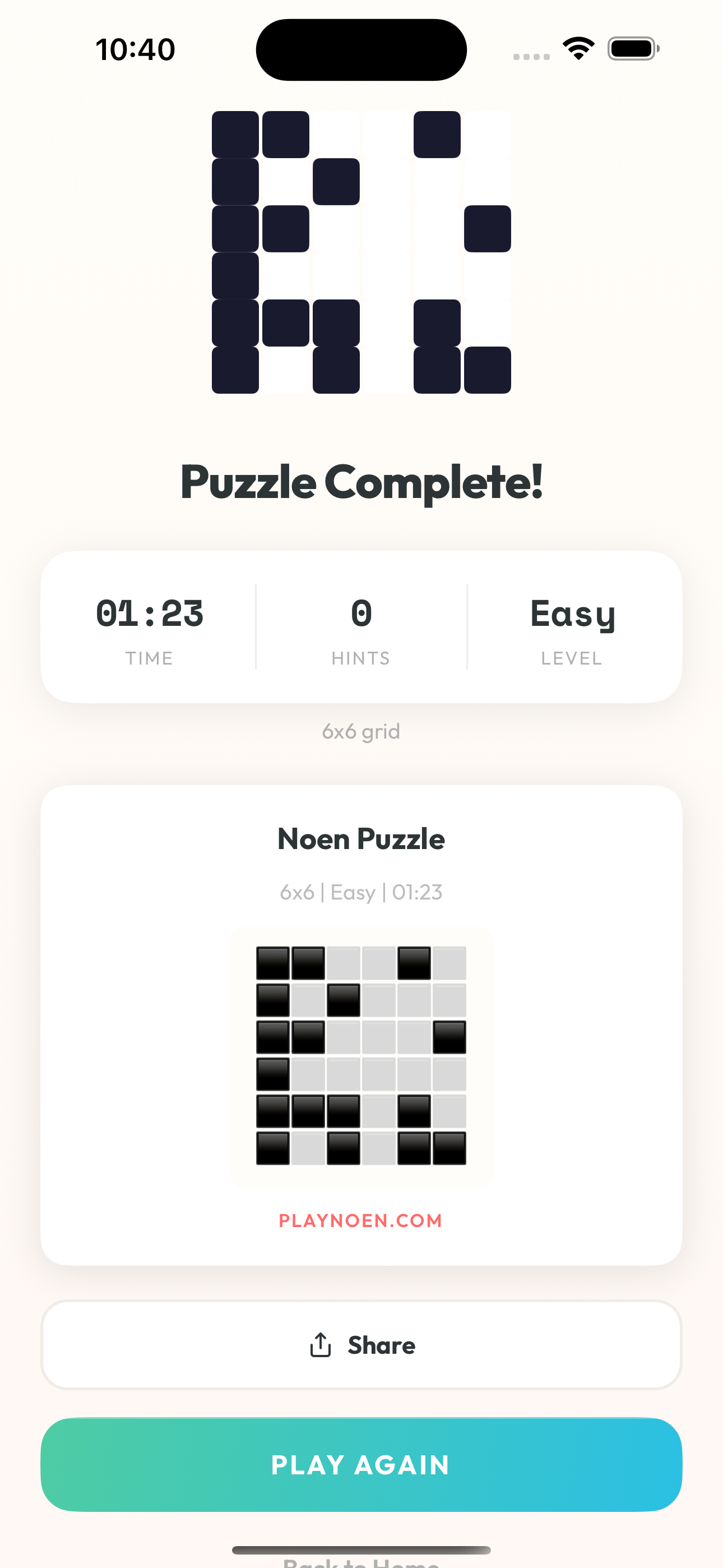 Noen is a nonogram puzzle game where every solution reveals a hidden picture. Challenge your logic daily, track your streak, and share your results.