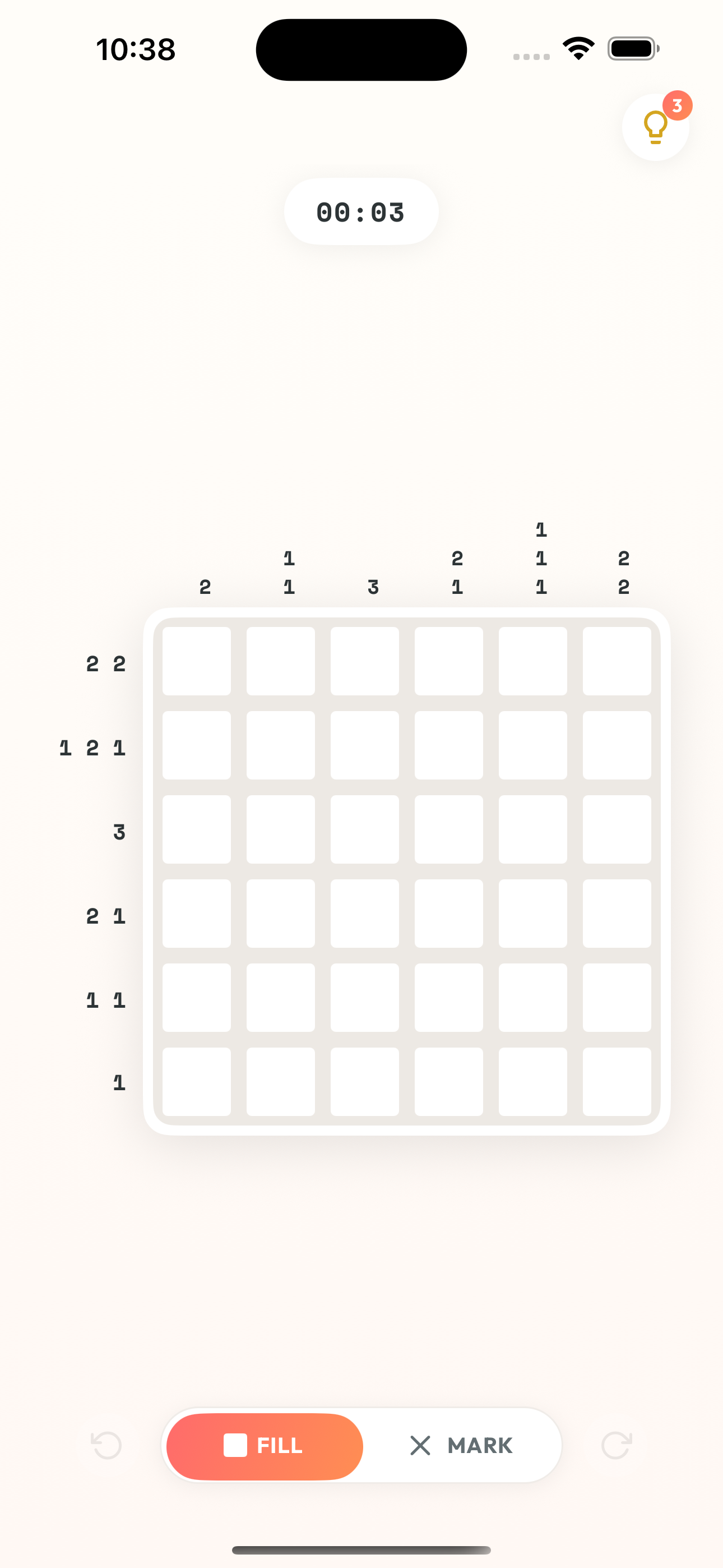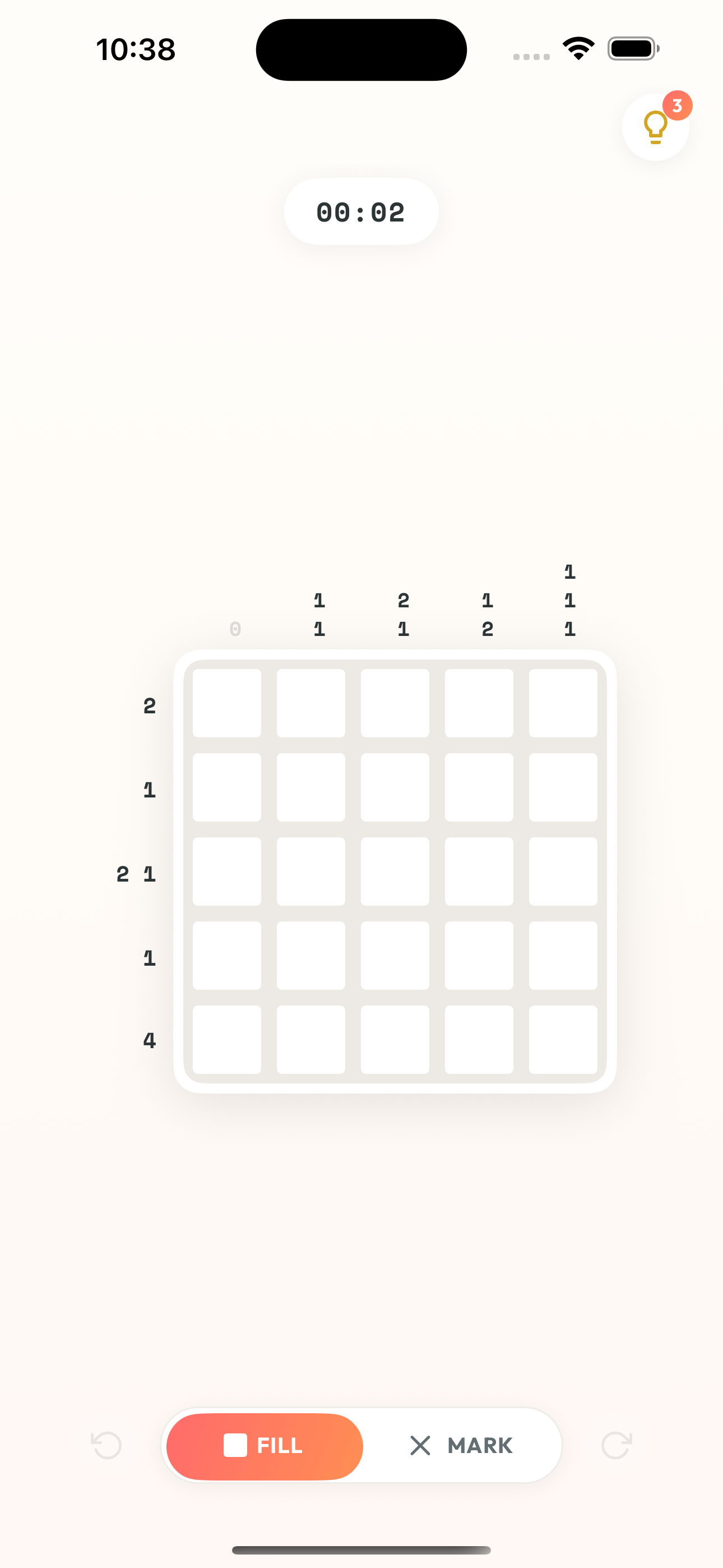 Tap to fill cells you know are correct. Switch to Mark mode to X out cells you know are empty. Swipe across for speed.